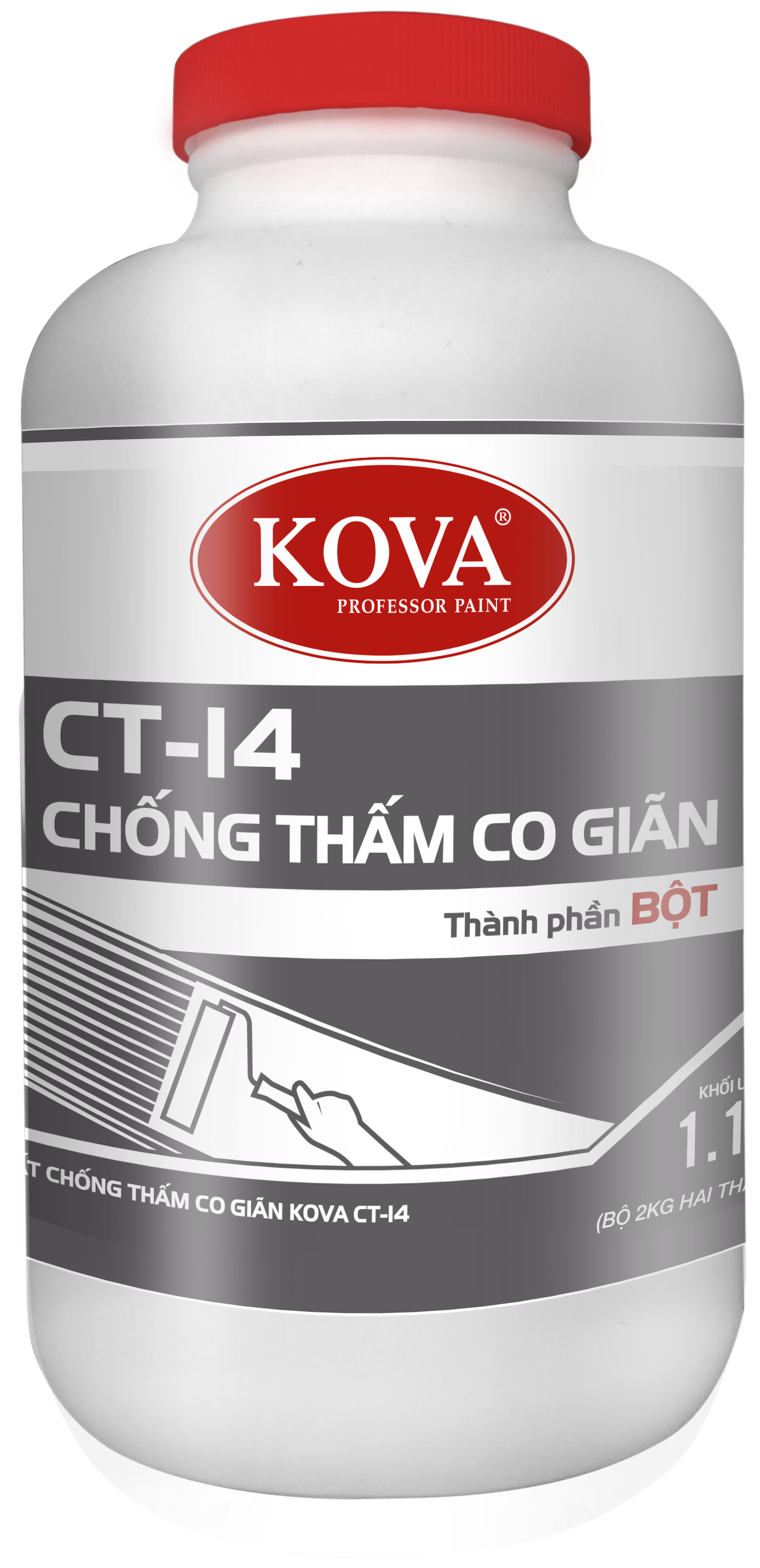 Chất chống thấm co giãn Kova CT-14 có độ co giãn rất cao, bám dính tốt vào ximăng và bêtông. Dùng để trám trét khe nứt lớn, mối nối hoặc khe co giãn. Nếu muốn chống thấm co giãn cho sàn hoặc tường thì phủ một lớp chống thấm CT-11A Sàn/ Tường để tạo chân bám trước khi trét chống thấm co giãn CT-14